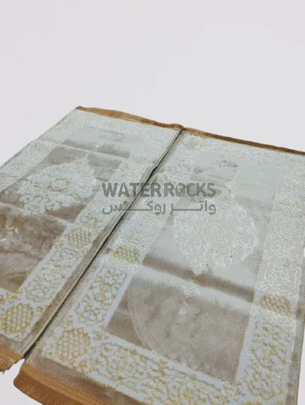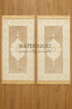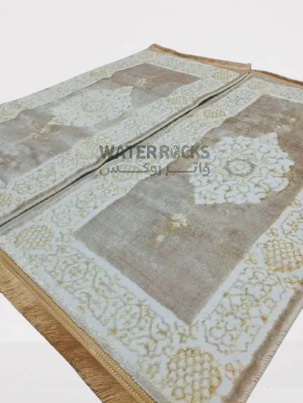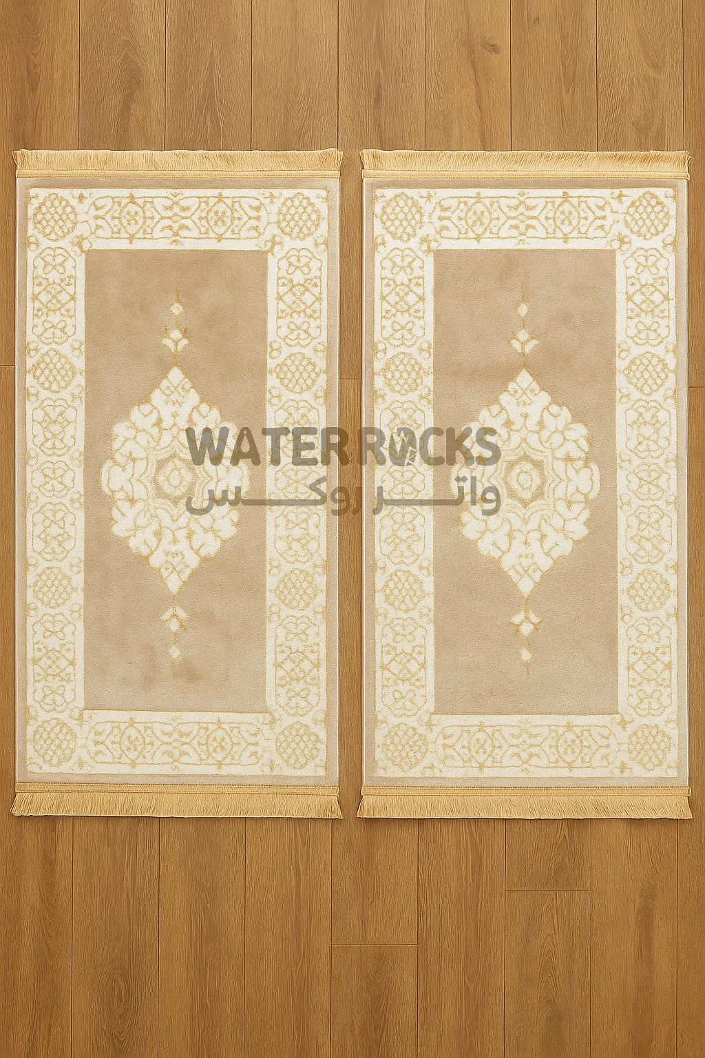 Ces deux tapis identiques, beiges avec de jolis motifs dorés traditionnels, sont parfaits pour l’entrée de votre maison ou comme descentes de lit pour une touche de confort et d’élégance. Ils sont doux et ont des franges.
