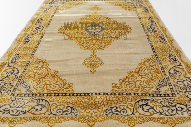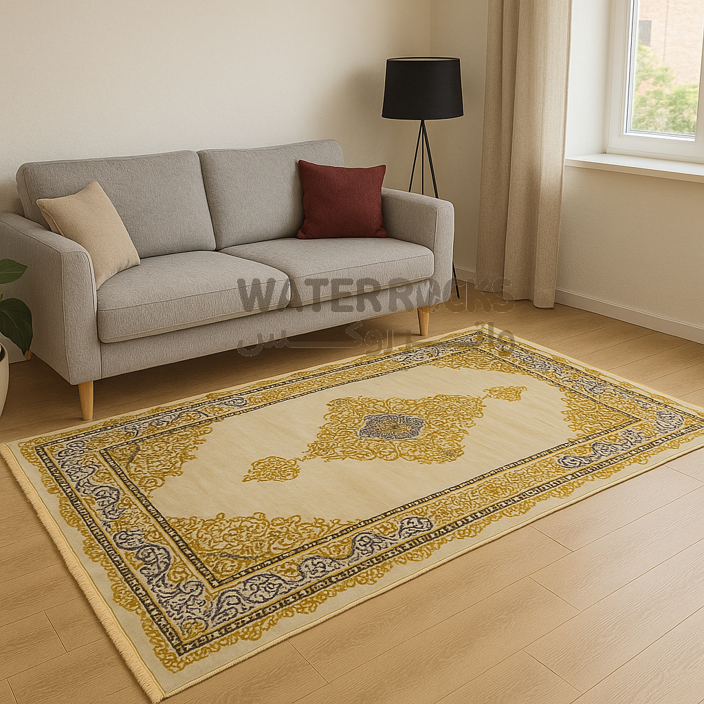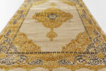 Ce tapis est de forme rectangulaire et présente un design riche et détaillé. Le fond est d’une couleur claire, tirant vers le beige ou le crème. Le motif central est dominé par des arabesques et des volutes complexes de couleur jaune doré, souvent rehaussées par des touches de noir.
