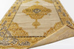 Un grand médaillon circulaire, également aux motifs dorés et sombres, se trouve au centre. Des ornements stylisés s’étendent vers les bords du tapis. Une large bordure entoure le tapis, reprenant les mêmes motifs élaborés et la même palette de couleurs. Des franges courtes de couleur jaune clair sont visibles aux extrémités. L’ensemble dégage une impression de luxe et de sophistication.