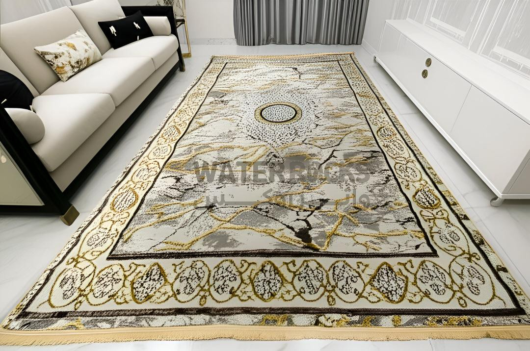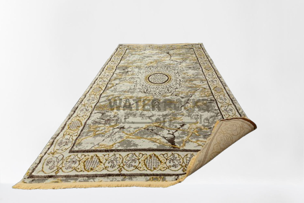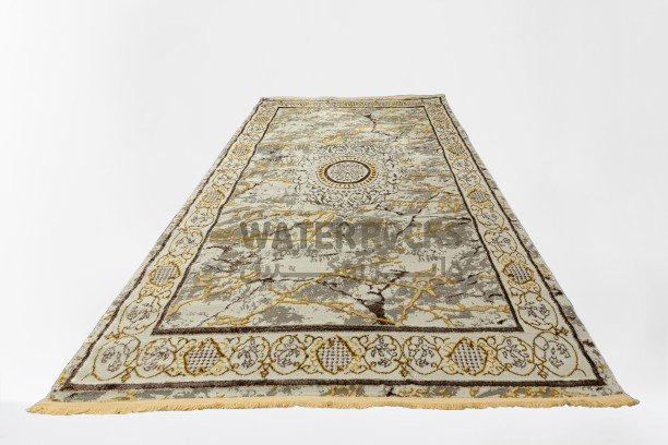 Ce tapis rectangulaire est de couleur principale claire (blanc cassé/gris clair) avec des motifs dorés et gris foncé, donnant un aspect texturé ou marbré. Il possède un médaillon circulaire au centre et des bordures détaillées. Des franges claires sont présentes sur les bords courts.