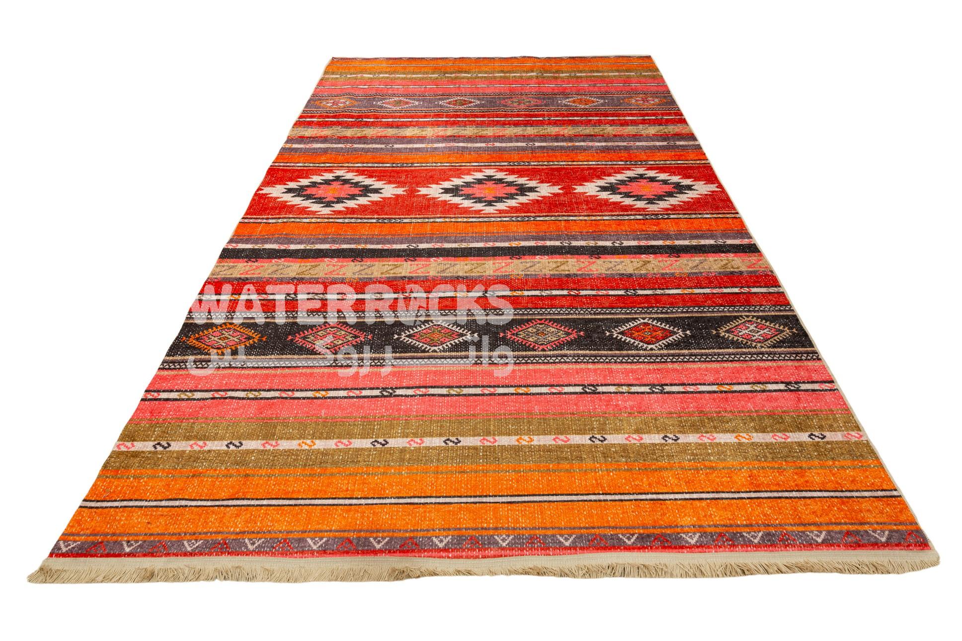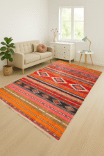 Ce tapis de séjour arbore un motif à rayures horizontales vives et géométriques dans des tons d’orange, rouge, marron et beige. Il est également anti-tâches et anti-dérapants, ce qui le rend idéal pour un salon ou une zone de vie.